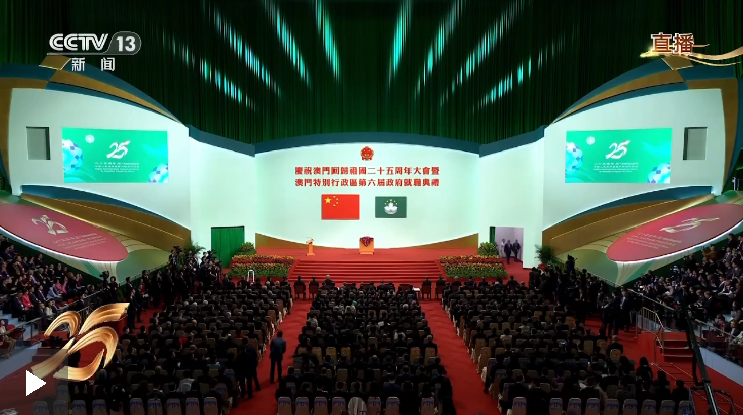 慶祝澳門回歸祖國二十五周年大會暨澳門特別行政區(qū)第六屆政府就職典禮現(xiàn)在開始。