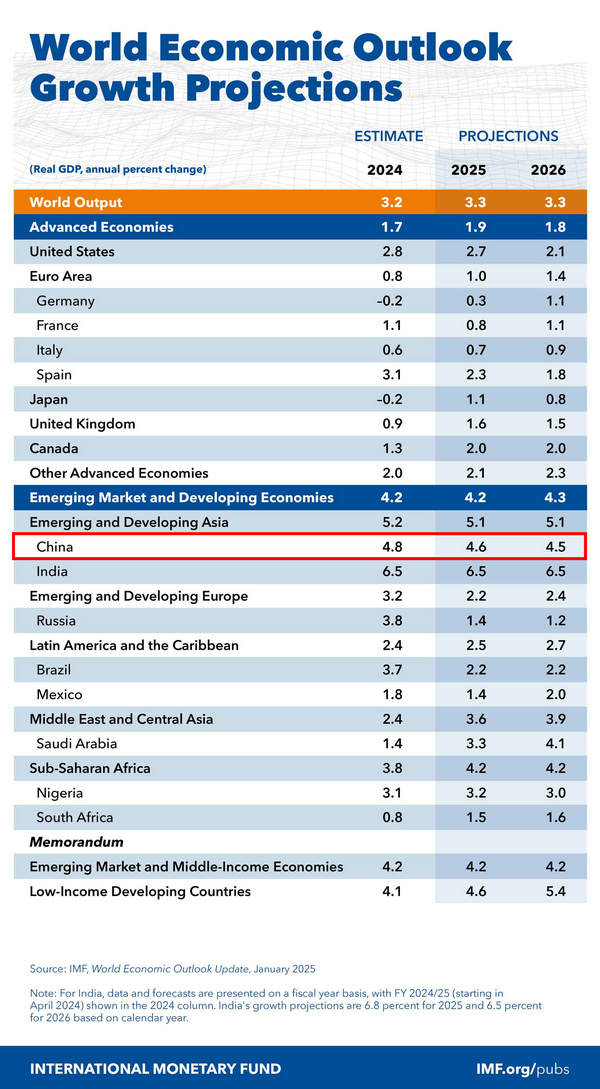 具體來看,發(fā)達(dá)經(jīng)濟(jì)體今年預(yù)計(jì)將增長1.9%,明年預(yù)計(jì)將增長1.8%。美國和歐元區(qū)經(jīng)濟(jì)預(yù)計(jì)今年將分別增長2.7%和1.0%,明年將分別增長2.1%和1.4%。新興市場和發(fā)展中經(jīng)濟(jì)體今年預(yù)計(jì)將增長4.2%,明年將增長4.3%。中國經(jīng)濟(jì)預(yù)計(jì)今年將增長4.6%,較去年10月預(yù)測值高出0.1個(gè)百分點(diǎn);明年預(yù)計(jì)增長4.5%。