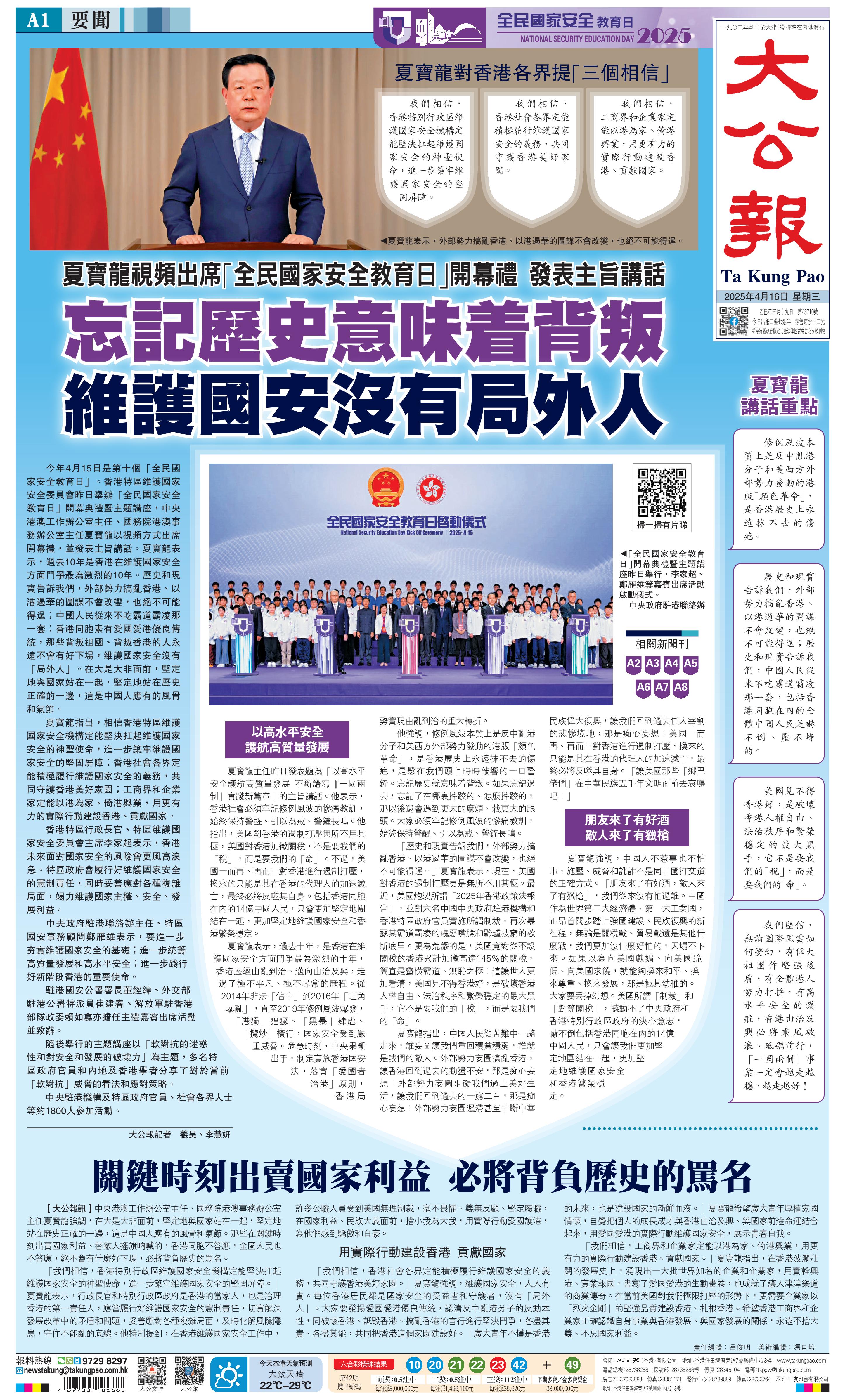「我們相信,香港社會各界定能積極履行維護(hù)國家安全的義務(wù),共同守護(hù)香港美好家園?!瓜膶汖垙?qiáng)調(diào),維護(hù)國家安全,人人有責(zé)。每位香港居民都是國家安全的受益者和守護(hù)者,沒有「局外人」。大家要發(fā)揚(yáng)愛國愛港優(yōu)良傳統(tǒng),認(rèn)清反中亂港分子的反動本性,同破壞香港、詆毀香港、搞亂香港的言行進(jìn)行堅決斗爭,各盡其責(zé)、各盡其能,共同把香港這個家園建設(shè)好。 「廣大青年不僅是香港的未來,也是建設(shè)國家的新鮮血液?!瓜膶汖埾M麖V大青年厚植家國情懷,自覺把個人的成長成才與香港由治及興、與國家前途命運結(jié)合起來,用愛國愛港的實際行動維護(hù)國家安全,展示青春自我。