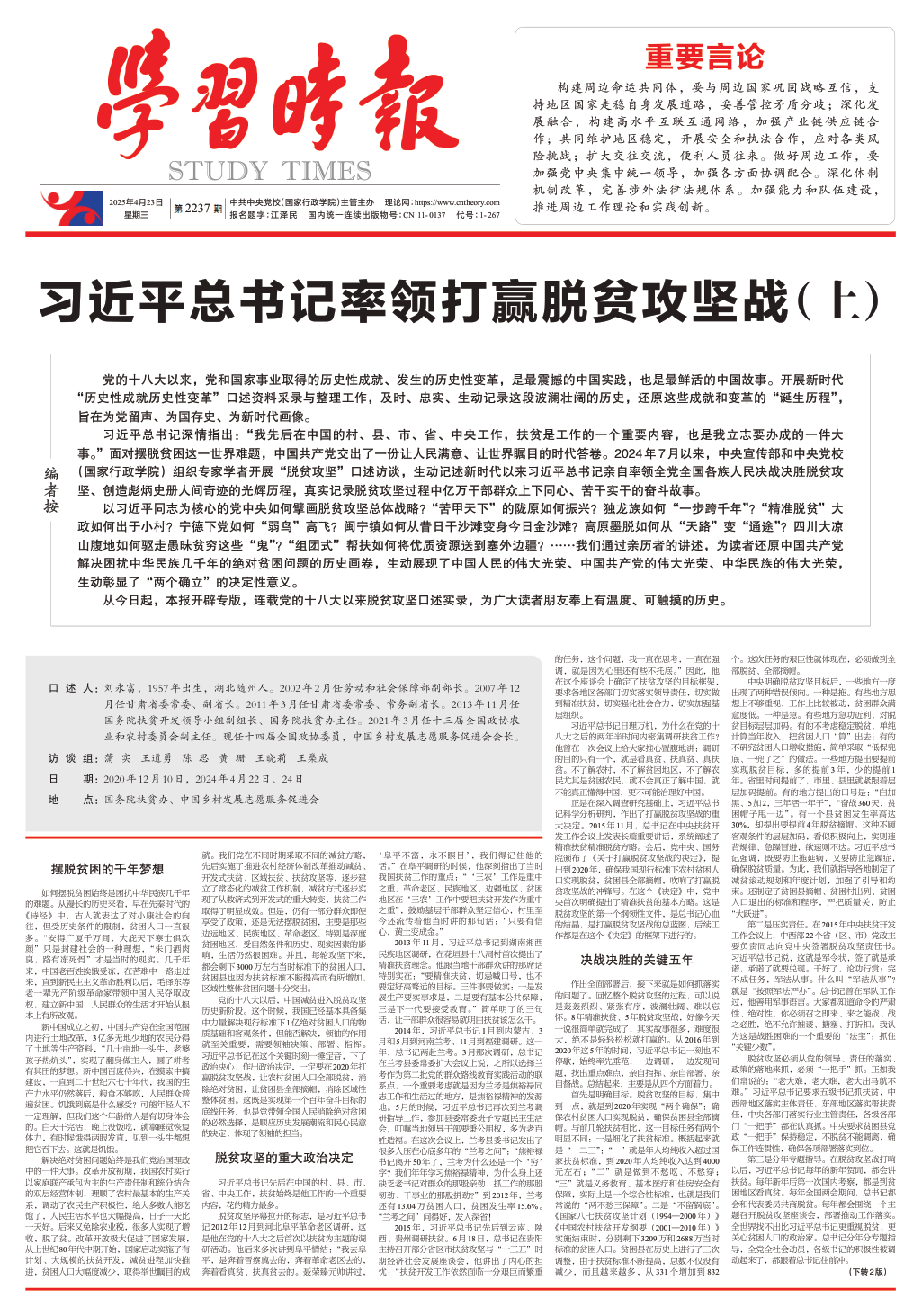 習(xí)近平總書記深情指出:“我先后在中國(guó)的村、縣、市、省、中央工作,扶貧是工作的一個(gè)重要內(nèi)容,也是我立志要辦成的一件大事?!泵鎸?duì)擺脫貧困這一世界難題,中國(guó)共產(chǎn)黨交出了一份讓人民滿意、讓世界矚目的時(shí)代答卷。2024年7月以來,中央宣傳部和中央黨校(國(guó)家行政學(xué)院)組織專家學(xué)者開展“脫貧攻堅(jiān)”口述訪談,生動(dòng)記述新時(shí)代以來習(xí)近平總書記親自率領(lǐng)全黨全國(guó)各族人民決戰(zhàn)決勝脫貧攻堅(jiān)、創(chuàng)造彪炳史冊(cè)人間奇跡的光輝歷程,真實(shí)記錄脫貧攻堅(jiān)過程中億萬(wàn)干部群眾上下同心、苦干實(shí)干的奮斗故事。