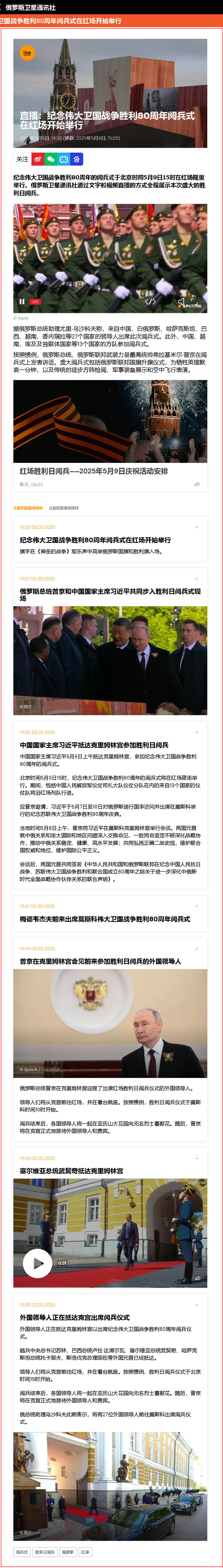 當(dāng)?shù)貢r(shí)間5月9日,俄羅斯舉行盛大慶典,紀(jì)念蘇聯(lián)偉大衛(wèi)國戰(zhàn)爭(zhēng)勝利80周年。國家主席習(xí)近平和來自世界20多個(gè)國家及國際組織領(lǐng)導(dǎo)人應(yīng)邀出席慶典。新華社記者 謝環(huán)馳 攝