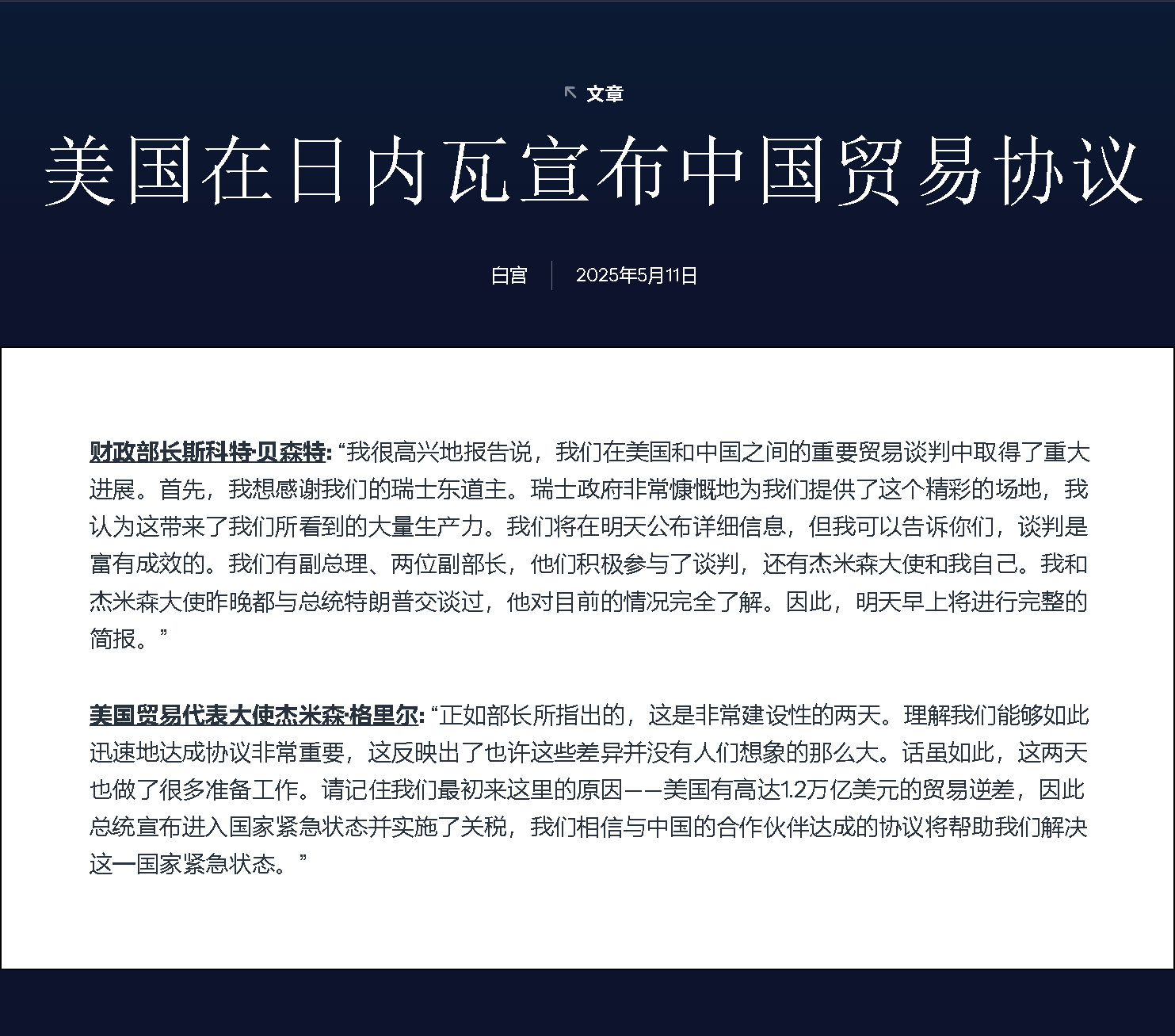 采取上述舉措后,雙方將建立機制,繼續(xù)就經貿關系進行協(xié)商。中方代表是國務院副總理何立峰,美方代表是財政部長斯科特·貝森特和美國貿易代表賈米森·格里爾。協(xié)商可在中國、美國,或雙方商定的第三國進行。根據需要,雙方可就相關經貿議題開展工作層面磋商。