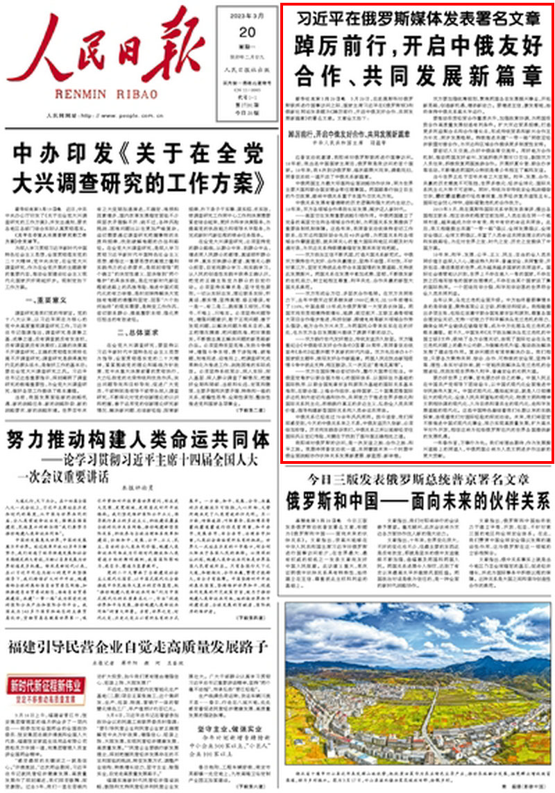 新華社北京3月20日電 3月20日,在赴莫斯科對(duì)俄羅斯聯(lián)邦進(jìn)行國(guó)事訪問(wèn)之際,國(guó)家主席習(xí)近平在《俄羅斯報(bào)》和俄新社網(wǎng)站發(fā)表題為《踔厲前行,開(kāi)啟中俄友好合作、共同發(fā)展新篇章》的署名文章。文章全文如下: