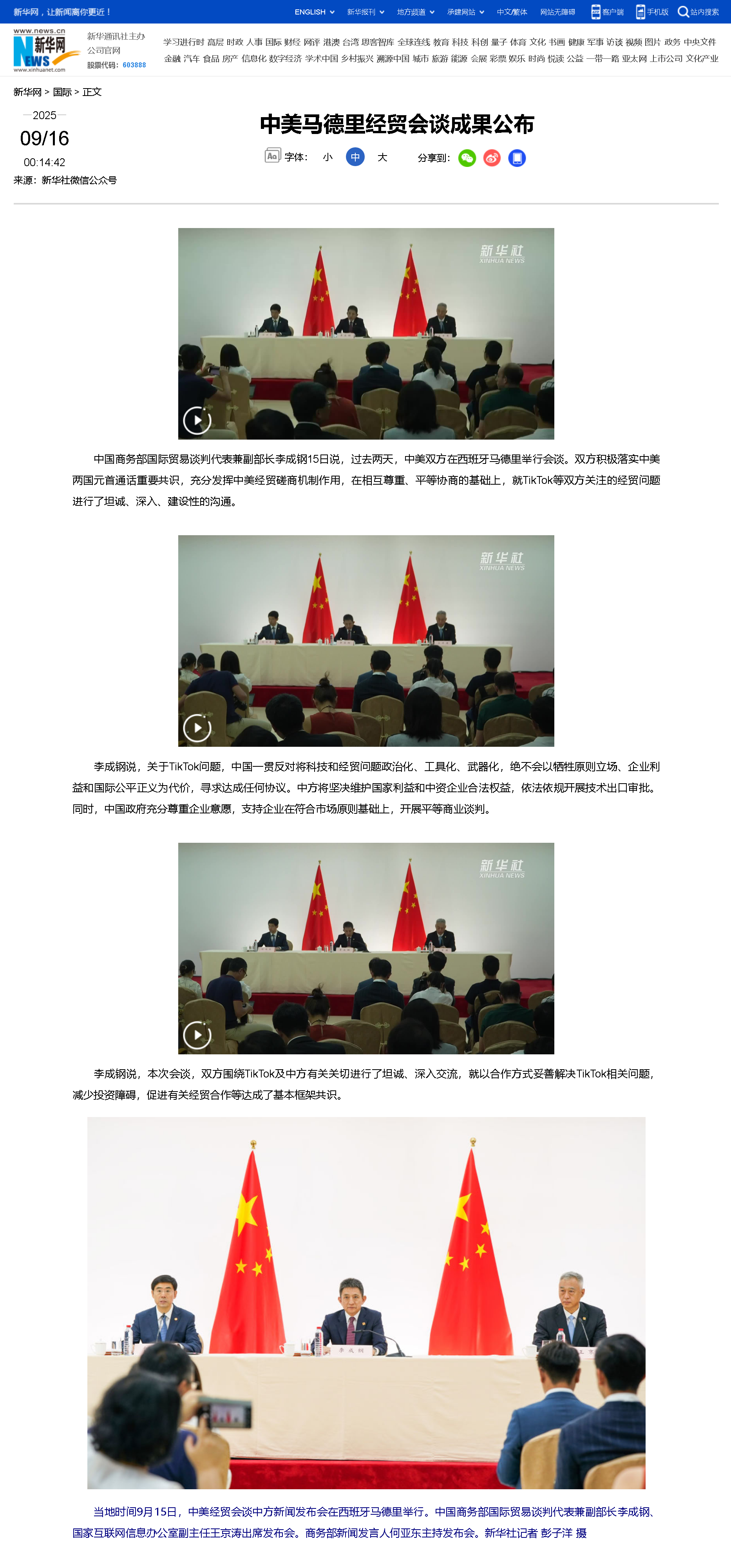新華社快訊:中國商務部國際貿(mào)易談判代表兼副部長李成鋼15日說,本次會談,雙方圍繞TikTok及中方有關關切進行了坦誠、深入交流,就以合作方式妥善解決TikTok相關問題,減少投資障礙,促進有關經(jīng)貿(mào)合作等達成了基本框架共識。