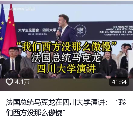 “中國與法國肩負(fù)著共同責(zé)任?!狈▏偨y(tǒng)馬克龍12月5日在四川大學(xué)發(fā)表演講時表示,法中在經(jīng)濟(jì)、外交等領(lǐng)域有著共同愿景,通過人文、學(xué)術(shù)等多領(lǐng)域交流,雙方可以推動各國人民攜手合作,共同建設(shè)一個能夠應(yīng)對時代挑戰(zhàn)的21世紀(jì)。
