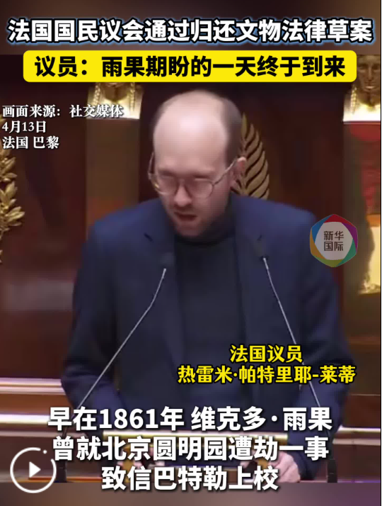 法國(guó)議員熱雷米·帕特里耶-萊蒂發(fā)言時(shí),提到法國(guó)文豪維克多·雨果的夢(mèng)想:“希望有一天法蘭西能脫胎換骨、洗心革面,將不義之財(cái)歸還被搶掠的中國(guó)”。