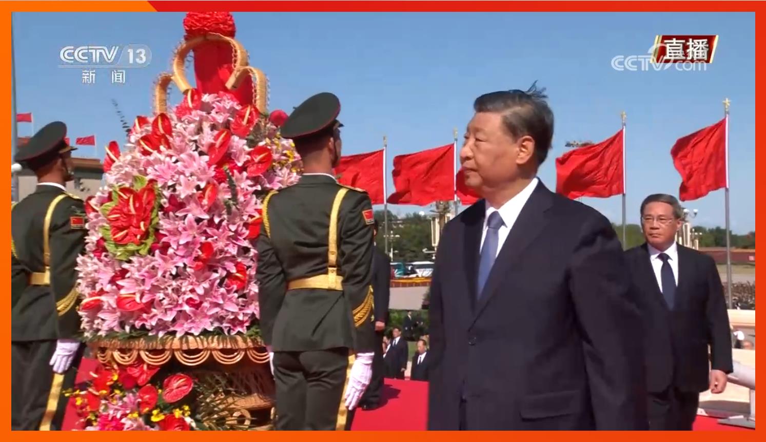 方陣前,以中共中央,全國(guó)人大常委會(huì),國(guó)務(wù)院,全國(guó)政協(xié),中央軍委,各民主黨派、全國(guó)工商聯(lián)和無(wú)黨派愛(ài)國(guó)人士,各人民團(tuán)體和各界群眾,老戰(zhàn)士、老同志和烈士親屬,中國(guó)少年先鋒隊(duì)名義敬獻(xiàn)的9個(gè)大型花籃一字排開(kāi),花籃紅色緞帶上書(shū)寫(xiě)的“人民英雄永垂不朽”格外醒目。