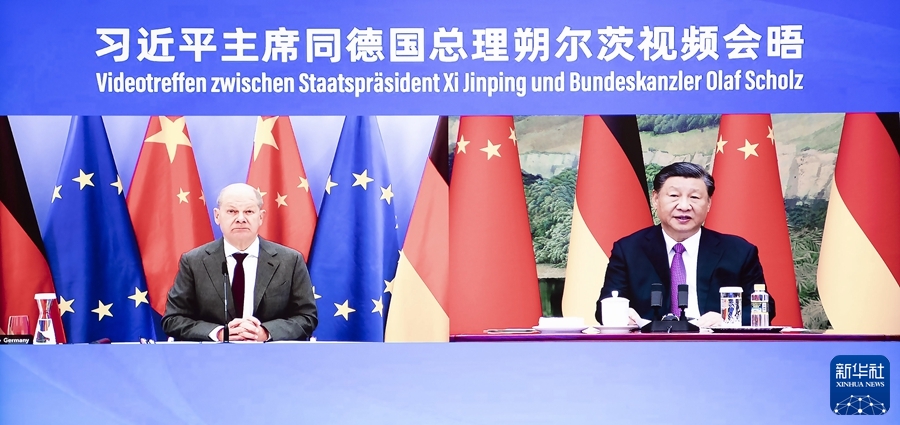 11月3日下午,國家主席習(xí)近平同德國總理朔爾茨舉行視頻會晤。新華社記者 黃敬文 攝