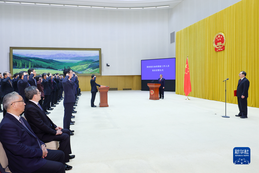 宣誓后,國務(wù)院總理李強(qiáng)作了講話。他強(qiáng)調(diào),誓詞雖短,但字字千鈞,希望大家把錚錚誓言銘記于心、踐之于行,忠于憲法、忠于祖國、忠于人民,不辜負(fù)黨和人民的重托。要堅(jiān)持用習(xí)近平新時(shí)代中國特色社會(huì)主義思想凝心鑄魂,深刻領(lǐng)悟“兩個(gè)確立”的決定性意義,堅(jiān)決做到“兩個(gè)維護(hù)”,不斷提高政治判斷力、政治領(lǐng)悟力、政治執(zhí)行力,當(dāng)好貫徹黨中央決策部署的執(zhí)行者、行動(dòng)派、實(shí)干家。要倍加珍惜黨和人民賦予的平臺(tái),以奮發(fā)有為的精神狀態(tài)干事創(chuàng)業(yè),緊緊圍繞推進(jìn)高質(zhì)量發(fā)展這個(gè)首要任務(wù),持續(xù)深化改革、擴(kuò)大開放、推動(dòng)創(chuàng)新、改善民生,勇于打破常規(guī),善于開辟新局,抓住主要矛盾綜合施策,聚焦瓶頸制約持續(xù)攻堅(jiān),以實(shí)干實(shí)績(jī)踐行誓言。要牢固樹立正確的權(quán)力觀、政績(jī)觀、事業(yè)觀,嚴(yán)格按照法定權(quán)限和程序履行職責(zé)、行使權(quán)力、承擔(dān)責(zé)任,始終繃緊廉潔自律這根弦,時(shí)時(shí)處處嚴(yán)格要求自己,堅(jiān)決反對(duì)形式主義、官僚主義,大力弘揚(yáng)勤儉節(jié)約、艱苦奮斗的優(yōu)良作風(fēng),為全面建設(shè)社會(huì)主義現(xiàn)代化國家、實(shí)現(xiàn)中華民族偉大復(fù)興中國夢(mèng)不懈奮斗。