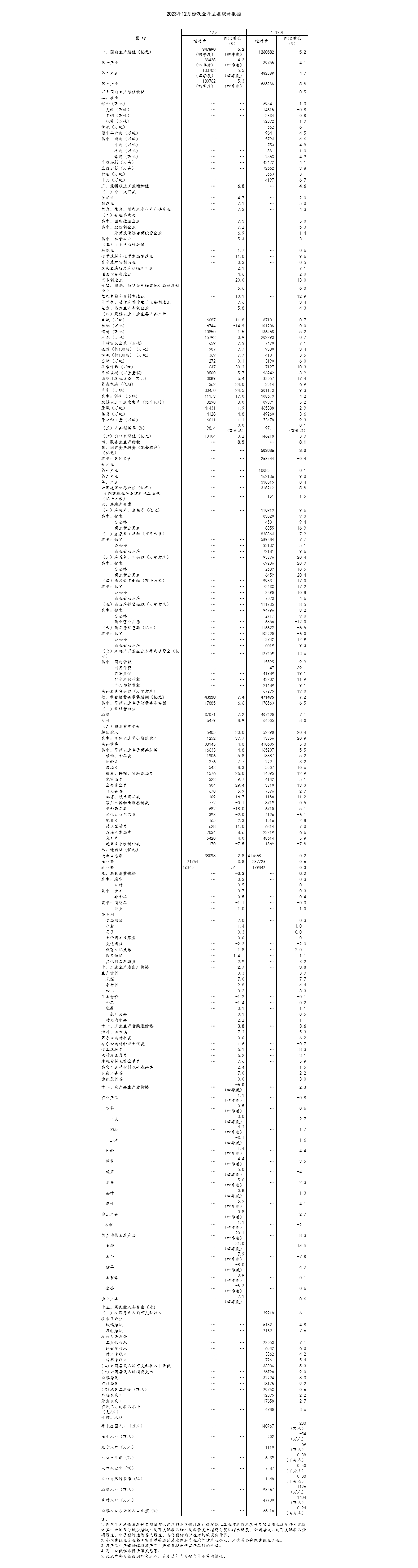 (1)國內(nèi)生產(chǎn)總值及其分類項(xiàng)目增長(zhǎng)速度按不變價(jià)計(jì)算,規(guī)模以上工業(yè)增加值及其分類項(xiàng)目增長(zhǎng)速度按可比價(jià)計(jì)算,均為實(shí)際增長(zhǎng)速度;其他指標(biāo)除特殊說明外,按現(xiàn)價(jià)計(jì)算,為名義增長(zhǎng)速度。