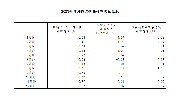 (2)根據(jù)季節(jié)調(diào)整模型自動(dòng)修正結(jié)果,對(duì)近一年來各期國內(nèi)生產(chǎn)總值、規(guī)模以上工業(yè)增加值、固定資產(chǎn)投資(不含農(nóng)戶)、社會(huì)消費(fèi)品零售總額環(huán)比增速進(jìn)行修訂。修訂結(jié)果及2023年四季度GDP環(huán)比數(shù)據(jù)、2023年12月份其他指標(biāo)環(huán)比數(shù)據(jù)如下: