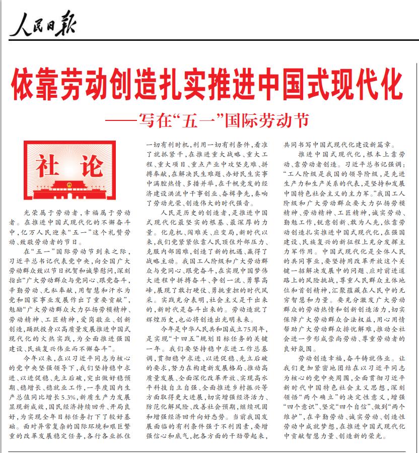 在“五一”國際勞動節(jié)到來之際,習近平總書記代表黨中央,向全國廣大勞動群眾致以節(jié)日祝賀和誠摯慰問,深刻指出“廣大勞動群眾與黨同心、跟黨奮斗,辛勤勞動、無私奉獻,用智慧和汗水為黨和國家事業(yè)發(fā)展作出了重要貢獻”,勉勵“廣大勞動群眾大力弘揚勞模精神、勞動精神、工匠精神,愛崗敬業(yè)、創(chuàng)新創(chuàng)造,踴躍投身以高質(zhì)量發(fā)展推進中國式現(xiàn)代化的火熱實踐,為全面推進強國建設(shè)、民族復興偉業(yè)而不懈奮斗”。