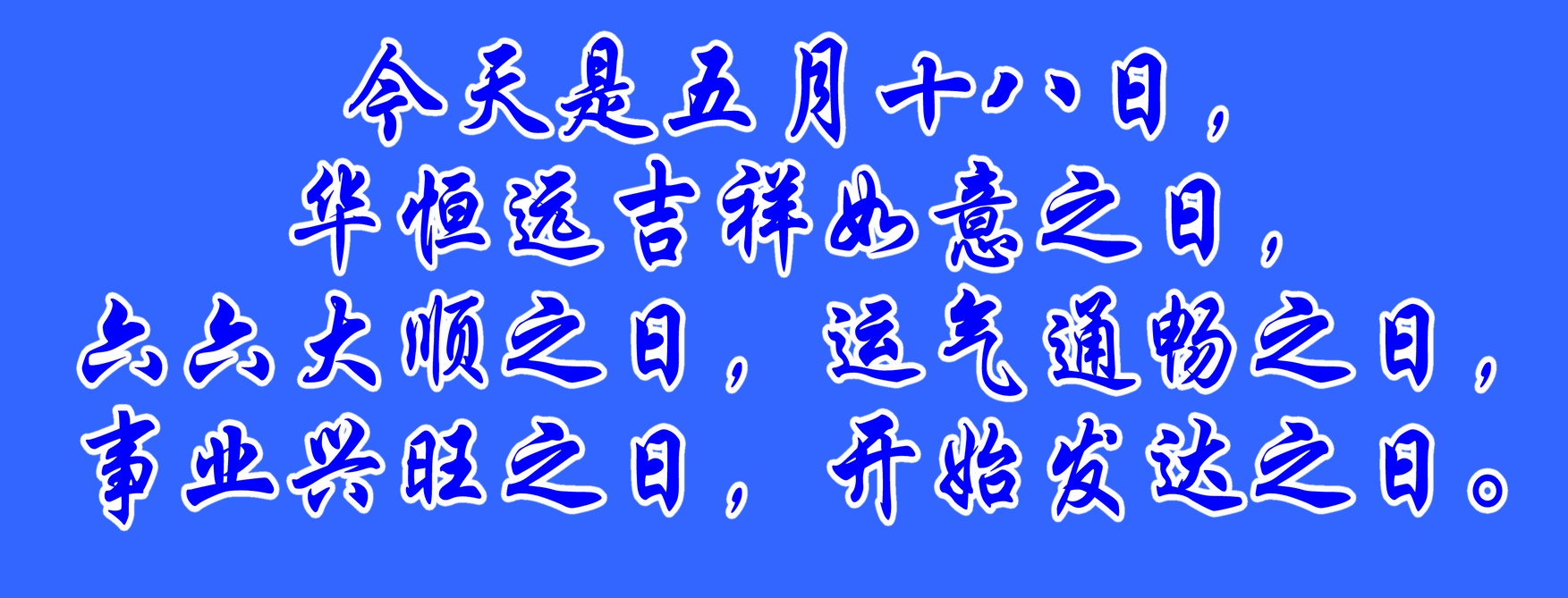 今天是五月十八日,華恒遠吉祥如意之日,六六大順之日,運氣通暢之日,事業(yè)興旺之日,開始發(fā)達之日。