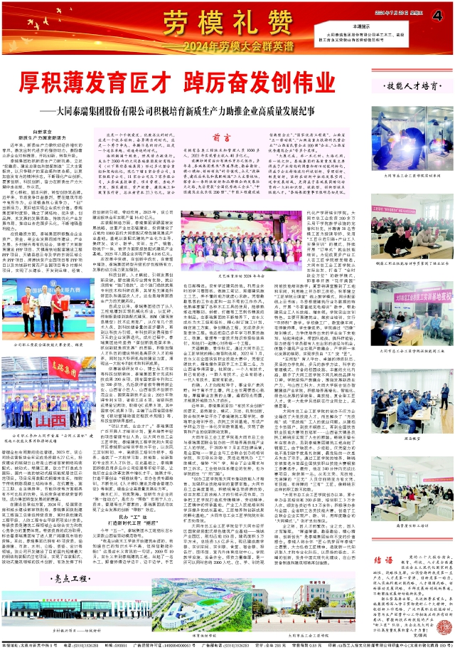 企之樹,因人才而繁茂;業(yè)之光,因人才而璀璨?!昂竦篮竦?、勤奮勤儉、精心精細(xì)、創(chuàng)新創(chuàng)優(yōu)”是泰瑞集團(tuán)始終不變的價(jià)值理念。泰瑞人將永懷“匠心筑夢(mèng)百年泰瑞”之愿景,大力弘揚(yáng)工匠精神,造就新一代知識(shí)型人才和專業(yè)化隊(duì)伍,以昂揚(yáng)的姿態(tài)、不竭的創(chuàng)新,投身中國(guó)式現(xiàn)代化建設(shè),在山西裝備制造和建筑領(lǐng)域再創(chuàng)佳績(jī)。