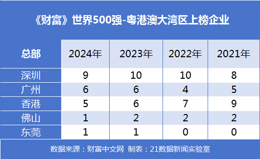從地域上看,此次上榜的大灣區(qū)公司中,總部集中在“五座萬億城”,深圳有9家公司上榜,數(shù)量位居大灣區(qū)第一;其次為廣州,有6家上榜,香港有5家公司上榜,佛山、東莞分別有1家公司位列世界500強(qiáng)。