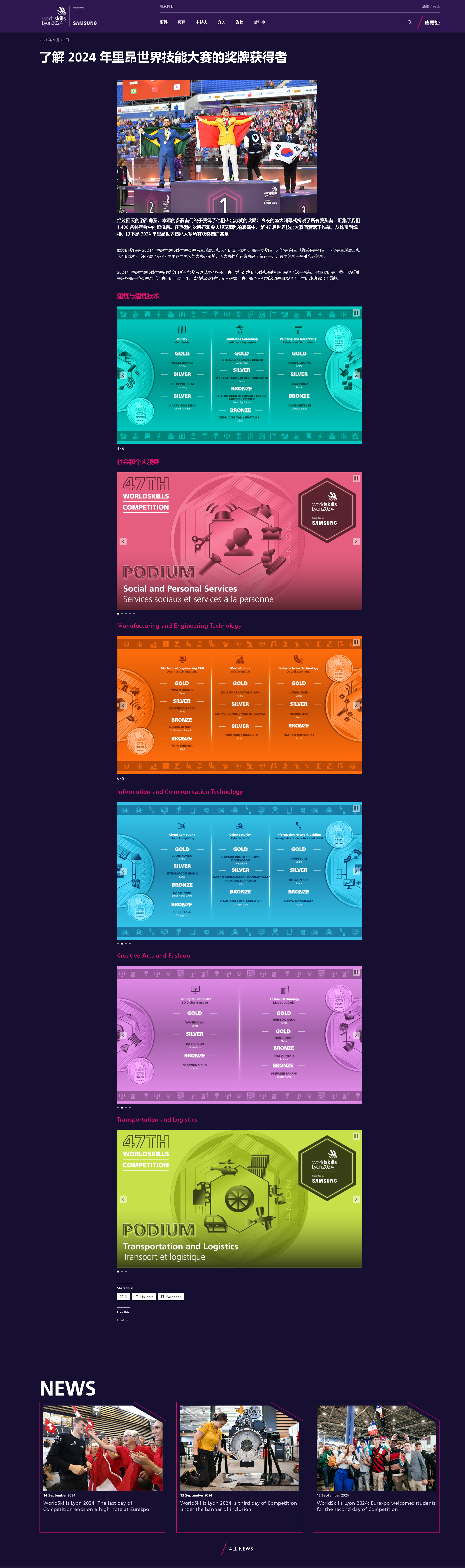 本屆大賽于9月10日至15日在里昂舉行,來自近70個國家和地區(qū)的約1400名選手參加。比賽項目包括運輸與物流、結(jié)構(gòu)與建筑技術(shù)、制造與工程技術(shù)、信息與通信技術(shù)、創(chuàng)意藝術(shù)與時尚、社會與個人服務6大類共59個比賽項目。中國派出68名選手參加了全部比賽項目。