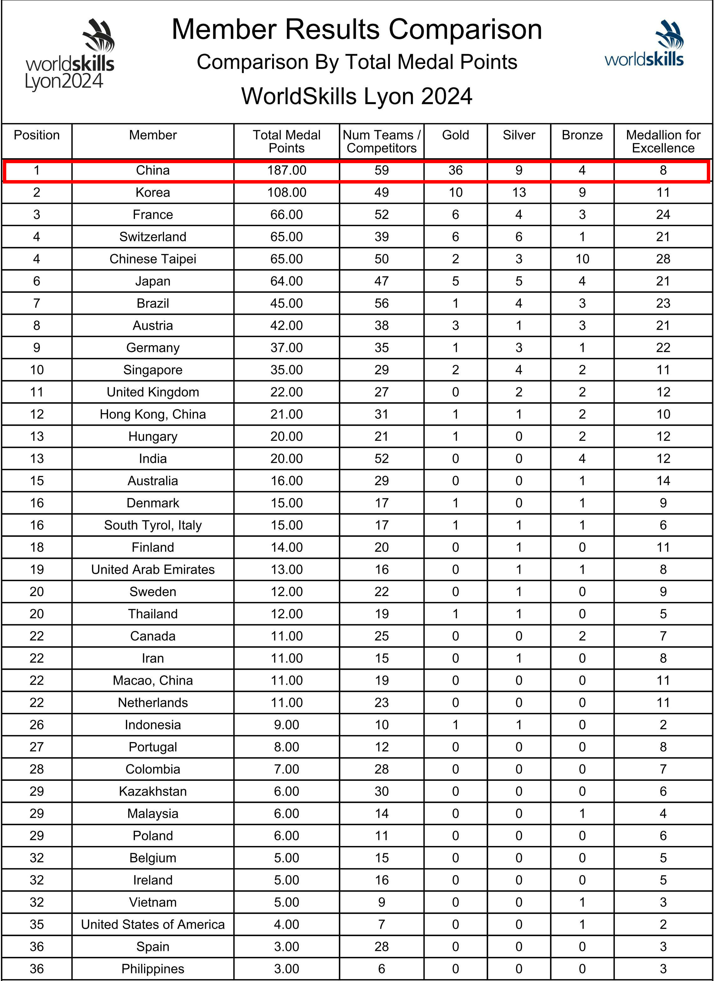 新華社法國里昂9月15日電 第47屆世界技能大賽15日晚在法國里昂閉幕,中國代表團在本次大賽中表現(xiàn)出色,在全部59個項目中,共獲得36枚金牌、9枚銀牌、4枚銅牌和8個優(yōu)勝獎,位居金牌榜、獎牌榜和團體總分首位。