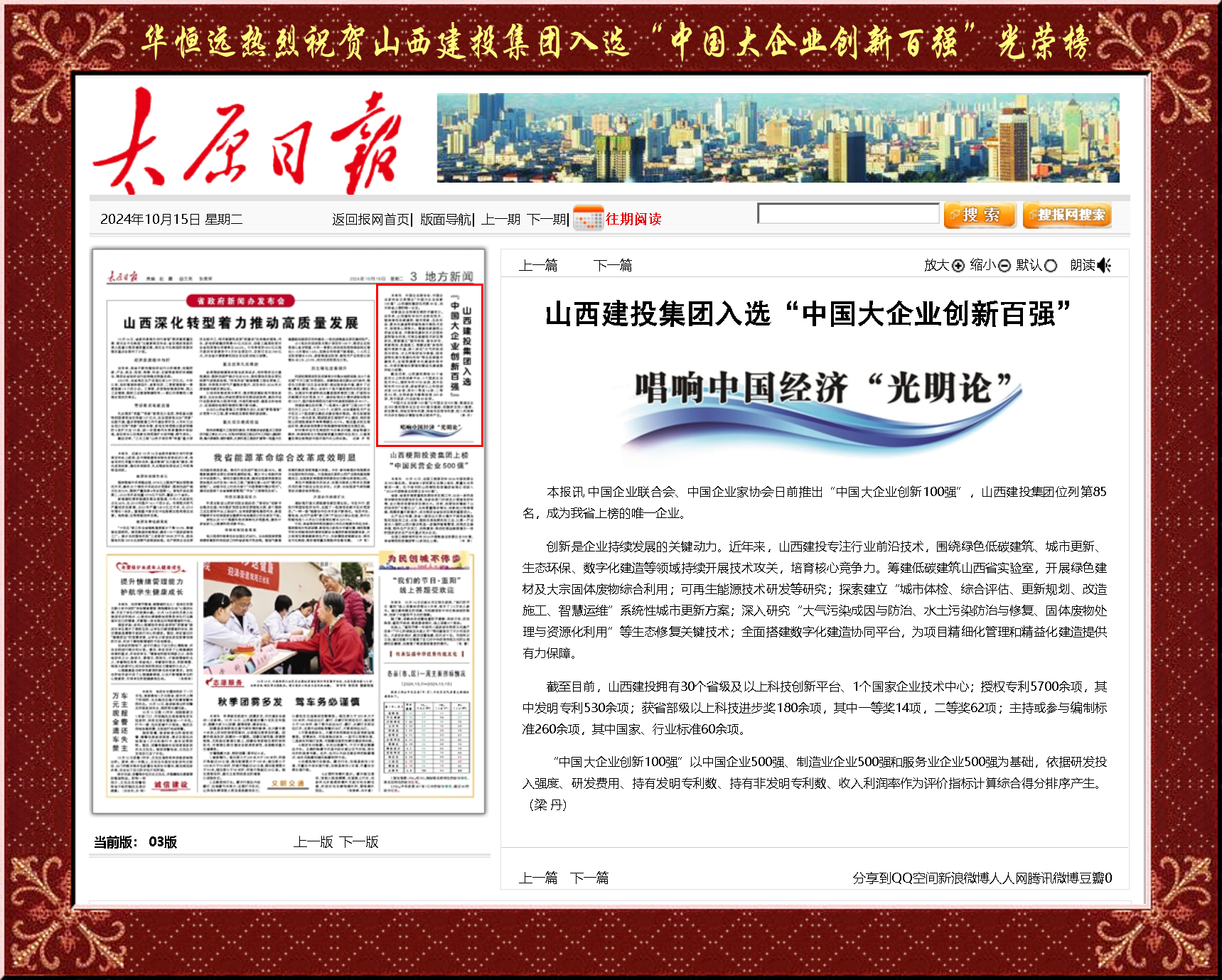 截至目前,山西建投擁有30個(gè)省級及以上科技創(chuàng)新平臺、1個(gè)國家企業(yè)技術(shù)中心;授權(quán)專利5700余項(xiàng),其中發(fā)明專利530余項(xiàng);獲省部級以上科技進(jìn)步獎180余項(xiàng),其中一等獎14項(xiàng),二等獎62項(xiàng);主持或參與編制標(biāo)準(zhǔn)260余項(xiàng),其中國家、行業(yè)標(biāo)準(zhǔn)60余項(xiàng)。