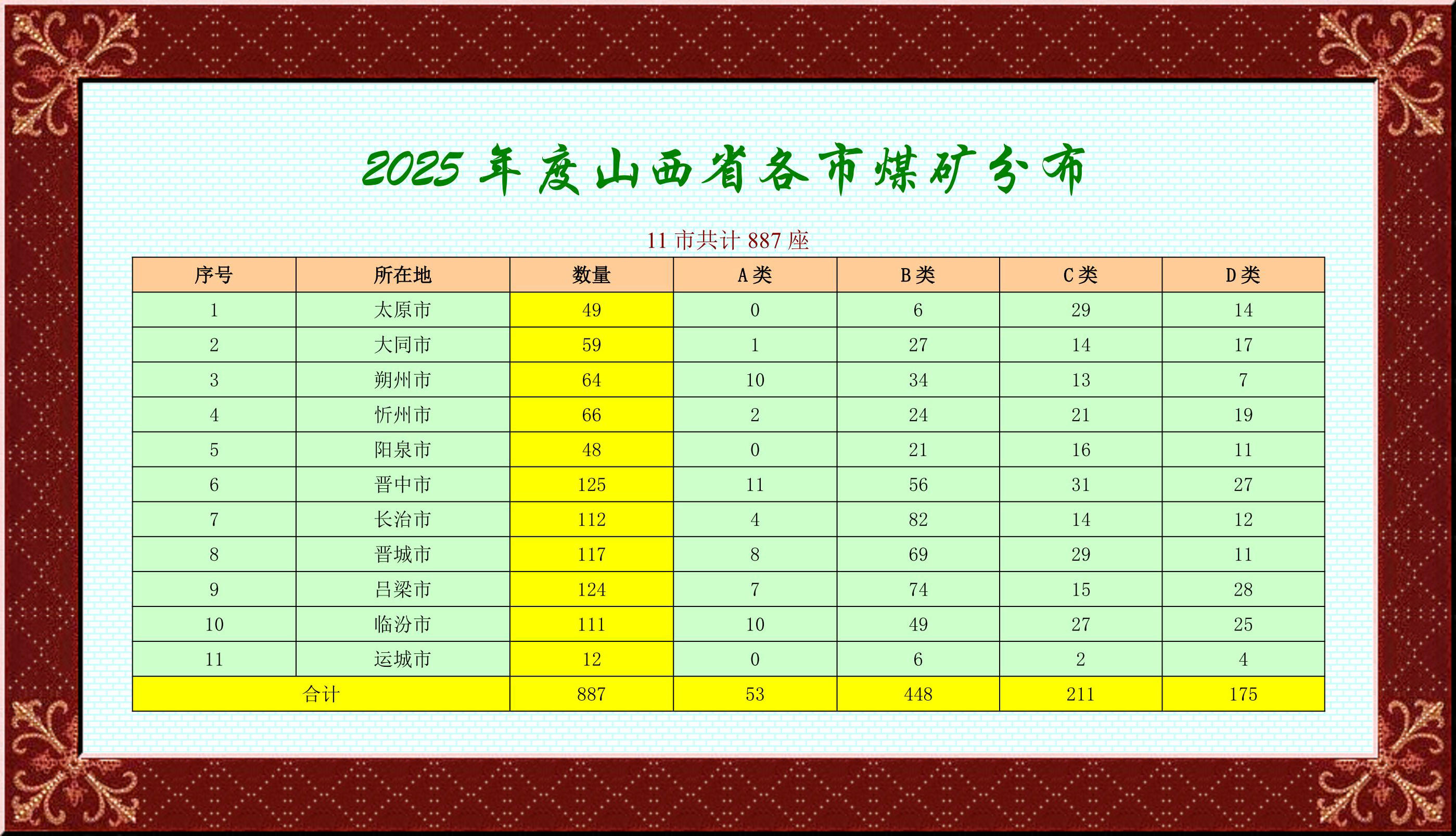 為進(jìn)一步推動(dòng)全省煤礦分類工作,按照省政府辦公廳《關(guān)于印發(fā)山西省煤礦分級(jí)分類安全監(jiān)管監(jiān)察辦法的通知》(晉政辦發(fā)〔2020〕22 號(hào))要求,省應(yīng)急廳對(duì)各市上報(bào)的 2025 年煤礦分類情況組織開展了審核、公示工作,其中 A 類煤礦 53 座、B 類煤礦 448 座、C 類煤礦 211 座、D 類煤礦 175 座。