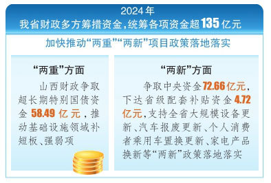“兩重”方面,山西財(cái)政爭取超長期特別國債資金58.49億元,推動(dòng)基礎(chǔ)設(shè)施領(lǐng)域補(bǔ)短板、強(qiáng)弱項(xiàng)?!皟尚隆狈矫妫瑺幦≈醒胭Y金72.66億元,下達(dá)省級(jí)配套補(bǔ)貼資金4.72億元,支持全省大規(guī)模設(shè)備更新、汽車報(bào)廢更新、個(gè)人消費(fèi)者乘用車置換更新、家電產(chǎn)品換新等“兩新”政策落地落實(shí)。