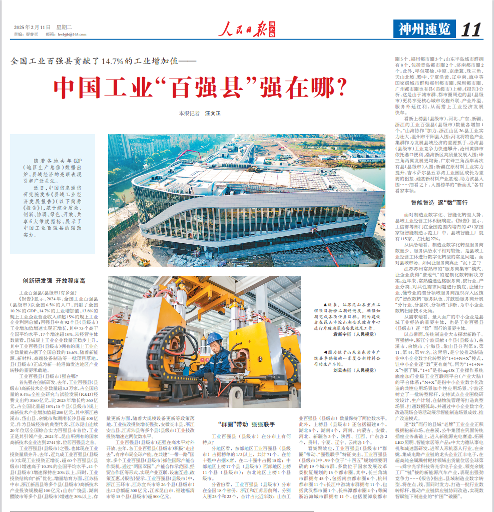 全國(guó)工業(yè)百?gòu)?qiáng)縣貢獻(xiàn)了14.7%的工業(yè)增加值——