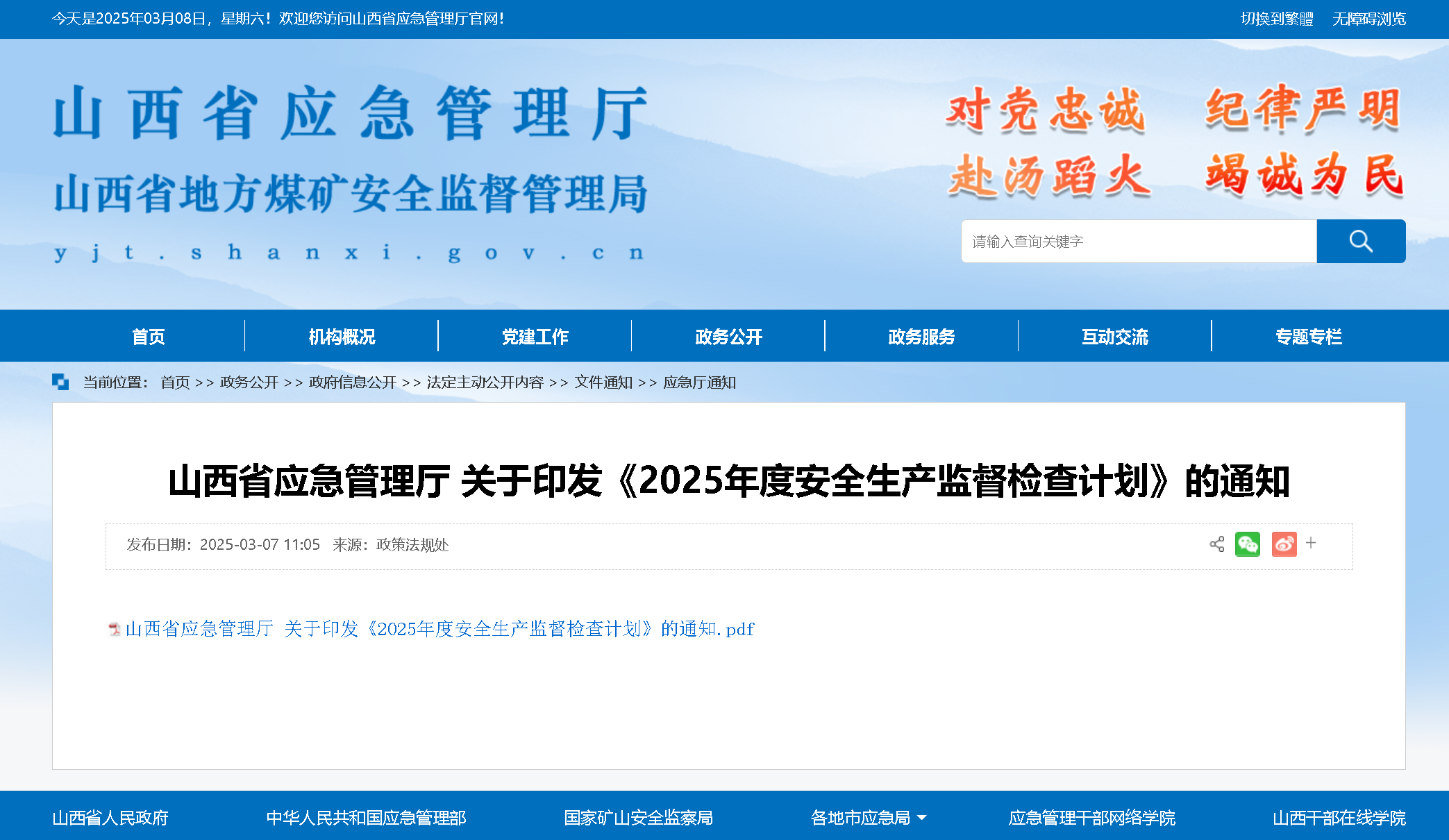 2025年3月6日,山西應急管理廳發(fā)布關于關于印發(fā)《2025年度安全生產(chǎn)監(jiān)督檢查計劃》的通知(晉應急發(fā)〔2025〕69號)