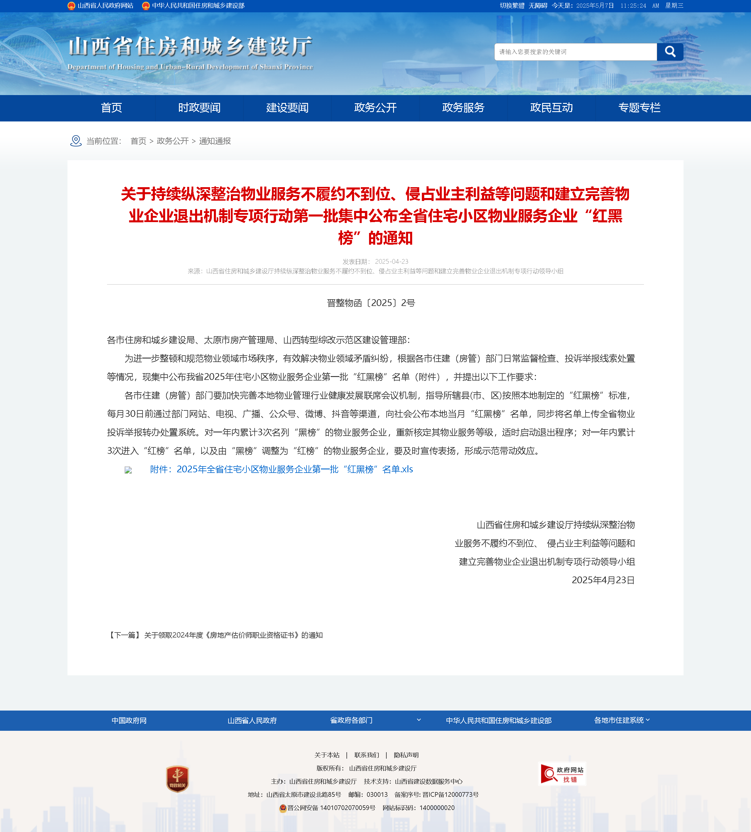 本報(bào)訊(記者晉帥妮)近日,為進(jìn)一步整頓和規(guī)范物業(yè)領(lǐng)域市場秩序,有效解決物業(yè)領(lǐng)域矛盾糾紛,省住建廳根據(jù)各市住建(房管)部門日常監(jiān)督檢查、投訴舉報(bào)線索處置等情況,公布我省2025年住宅小區(qū)物業(yè)服務(wù)企業(yè)第一批“紅黑榜”名單,共計(jì)304家企業(yè)登上紅榜,146家企業(yè)被列入黑榜。