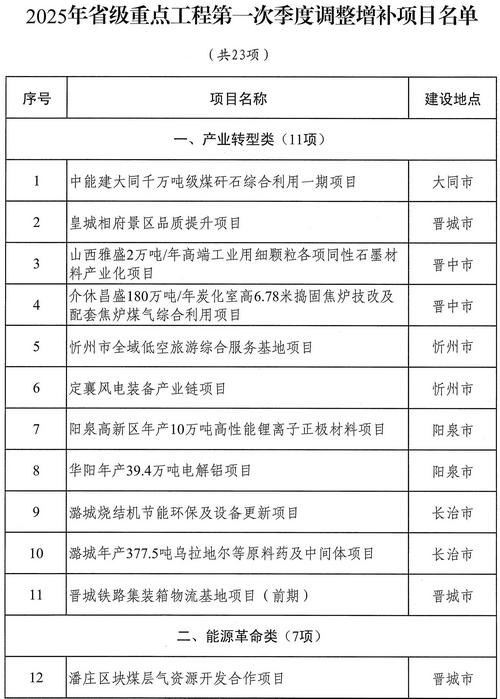 近日,山西發(fā)改委官網(wǎng)發(fā)布2025年省級(jí)重點(diǎn)工程第一次季度調(diào)整項(xiàng)目名單,本次共新增23個(gè)重點(diǎn)項(xiàng)目。其中,產(chǎn)業(yè)轉(zhuǎn)型類11項(xiàng),能源革命類7項(xiàng),科教人才類1項(xiàng),基礎(chǔ)設(shè)施類2項(xiàng),社會(huì)民生類2項(xiàng)。