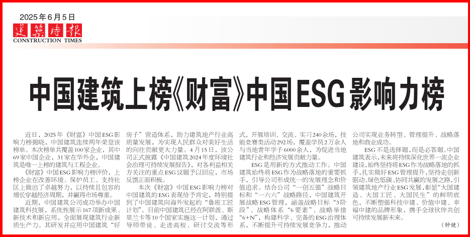 近日,2025年《財富》中國ESG影響力榜揭曉,中國建筑連續(xù)兩年榮登該榜單。本次榜單共覆蓋100家企業(yè),其中69家中國企業(yè),31家在華外企,中國建筑是唯一上榜的建筑與工程企業(yè)。