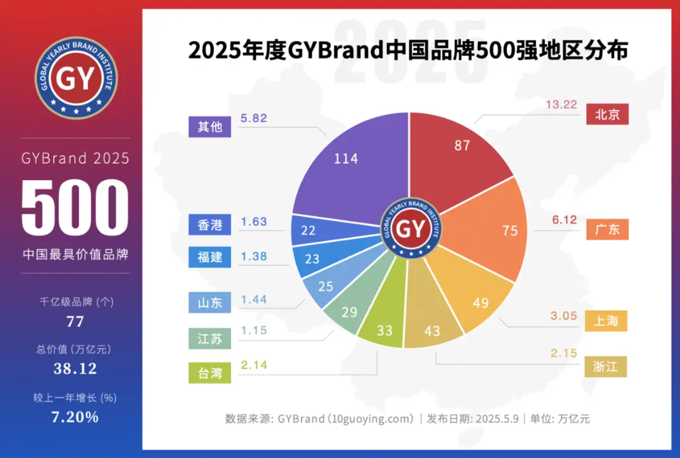 GYBrand近日發(fā)布的2025年中國最具價值品牌500榜單顯示(查看報告詳情>>),今年上榜的500個品牌總價值為38.12萬億人民幣,同比增長7.20%,共有77家企業(yè)的品牌價值達(dá)到千億級別。前十名單中,北京占據(jù)6個,廣東占了2個,香港和貴州各占1個,TOP10品牌總價值高達(dá)5.47萬億人民幣,占了500強(qiáng)品牌總價值的14.35%。