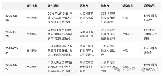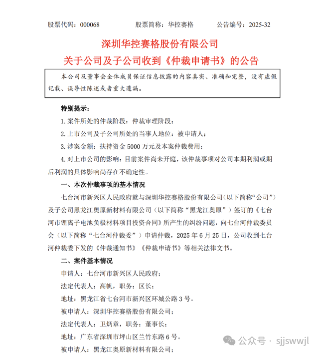 6月25日,華控賽格及子公司黑龍江奧原新材料有限公司收到七臺(tái)河仲裁委員會(huì)的《仲裁通知書(shū)》及相關(guān)法律文書(shū),6月27日首次披露仲裁情況,正式宣告案件進(jìn)入仲裁程序。