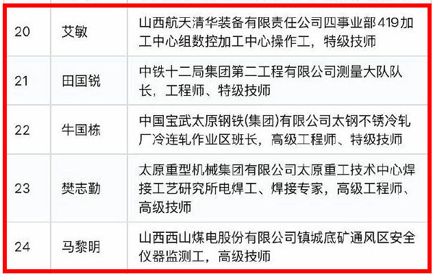 他們分別是:山西航天清華裝備有限責任公司四事業(yè)部419加工中心組數(shù)控加工中心操作工,特級技師艾敏;中鐵十二局集團第二工程有限公司測量大隊隊長,工程師、特級技師田國銳;中國寶武太原鋼鐵(集團)有限公司太鋼不銹冷軋廠冷連軋作業(yè)區(qū)班長,高級工程師、特級技師牛國棟;太原重型機械集團有限公司太原重工技術(shù)中心焊接工藝研究所電焊工、焊接專家,高級工程師、高級技師樊志勤;山西西山煤電股份有限公司鎮(zhèn)城底礦通風區(qū)安全儀器監(jiān)測工,高級技師馬黎明。