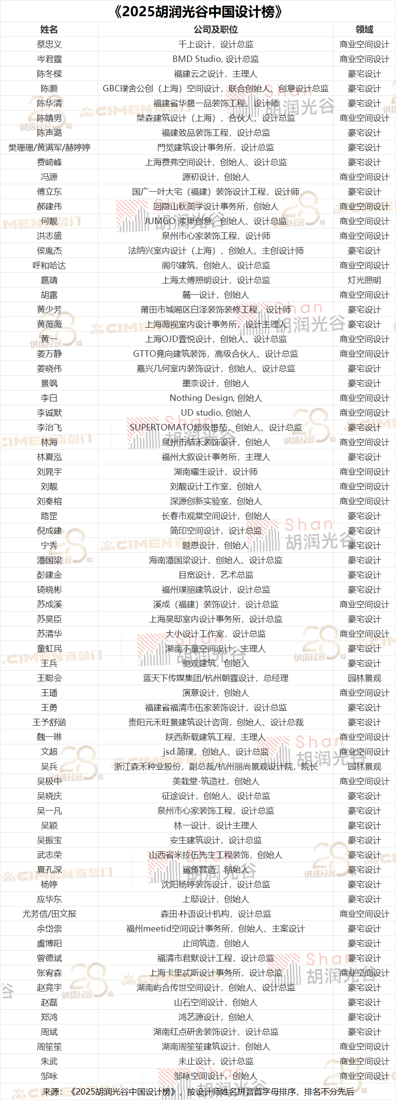 《2025胡潤(rùn)光谷中國(guó)設(shè)計(jì)榜》通過(guò)設(shè)計(jì)作品的創(chuàng)新性、美學(xué)價(jià)值、可持續(xù)性和商業(yè)價(jià)值進(jìn)行綜合評(píng)選。共征集到逾百位設(shè)計(jì)師的申報(bào)材料,由知名設(shè)計(jì)師、跨界嘉賓、商業(yè)精英、KOL、企業(yè)家、藝術(shù)家組成的顧問(wèn)評(píng)委團(tuán)進(jìn)行全面評(píng)審,最終71位設(shè)計(jì)師上榜,其中男性占84%,女性占16%。設(shè)計(jì)類別分布上,豪宅設(shè)計(jì)占6成,商業(yè)空間設(shè)計(jì)占4成。