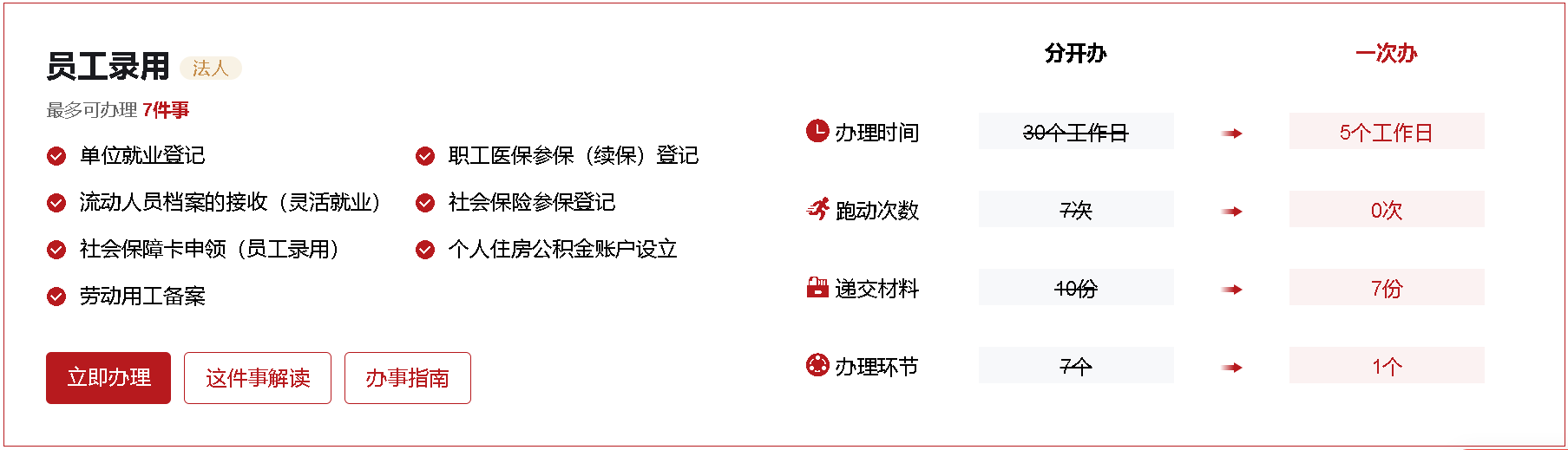 據(jù)悉,此次上線的“員工錄用一件事”服務(wù)對象覆蓋山西范圍內(nèi)所有用人企業(yè),整合人社部門負責的單位就業(yè)登記、社會保險參保登記、社會保障卡申領(lǐng)、流動人員檔案接收(員工錄用)、勞動用工備案,醫(yī)保部門負責的職工醫(yī)療保險參保(續(xù)保)登記,以及住建部門負責的個人住房公積金賬戶設(shè)立在內(nèi)的7項高頻關(guān)聯(lián)事項。以往企業(yè)需分別對接多個部門、跑7次窗口、歷經(jīng)30個工作日才能辦結(jié)的業(yè)務(wù),如今辦理環(huán)節(jié)壓縮至1個,在材料齊全、符合受理條件的情況下,最快1個工作日即可辦結(jié),最長不超過5個工作日,且全程不收取任何費用。