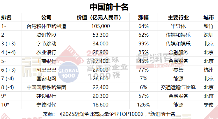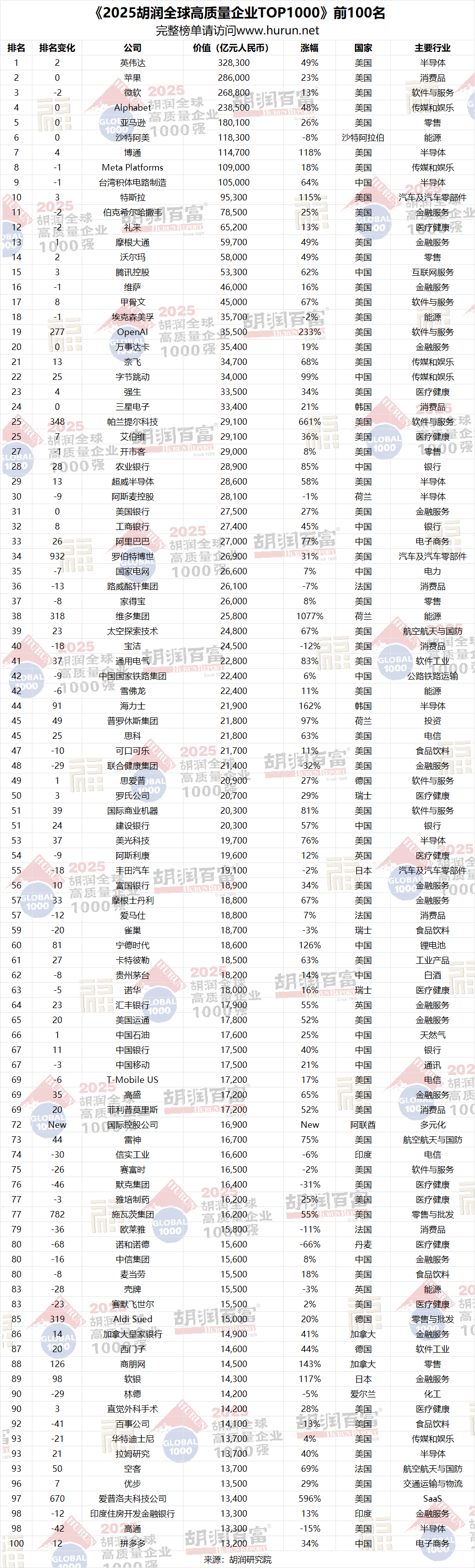 《2025胡潤(rùn)全球高質(zhì)量企業(yè)TOP1000》前100名