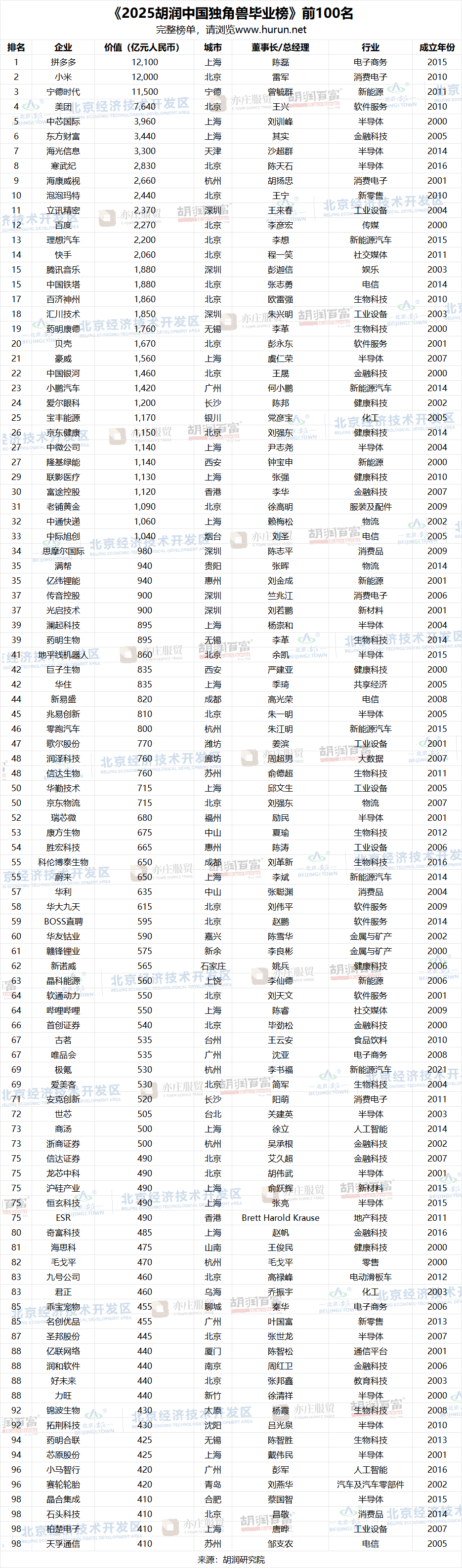 《2025胡潤(rùn)中國(guó)獨(dú)角獸畢業(yè)榜》前100名