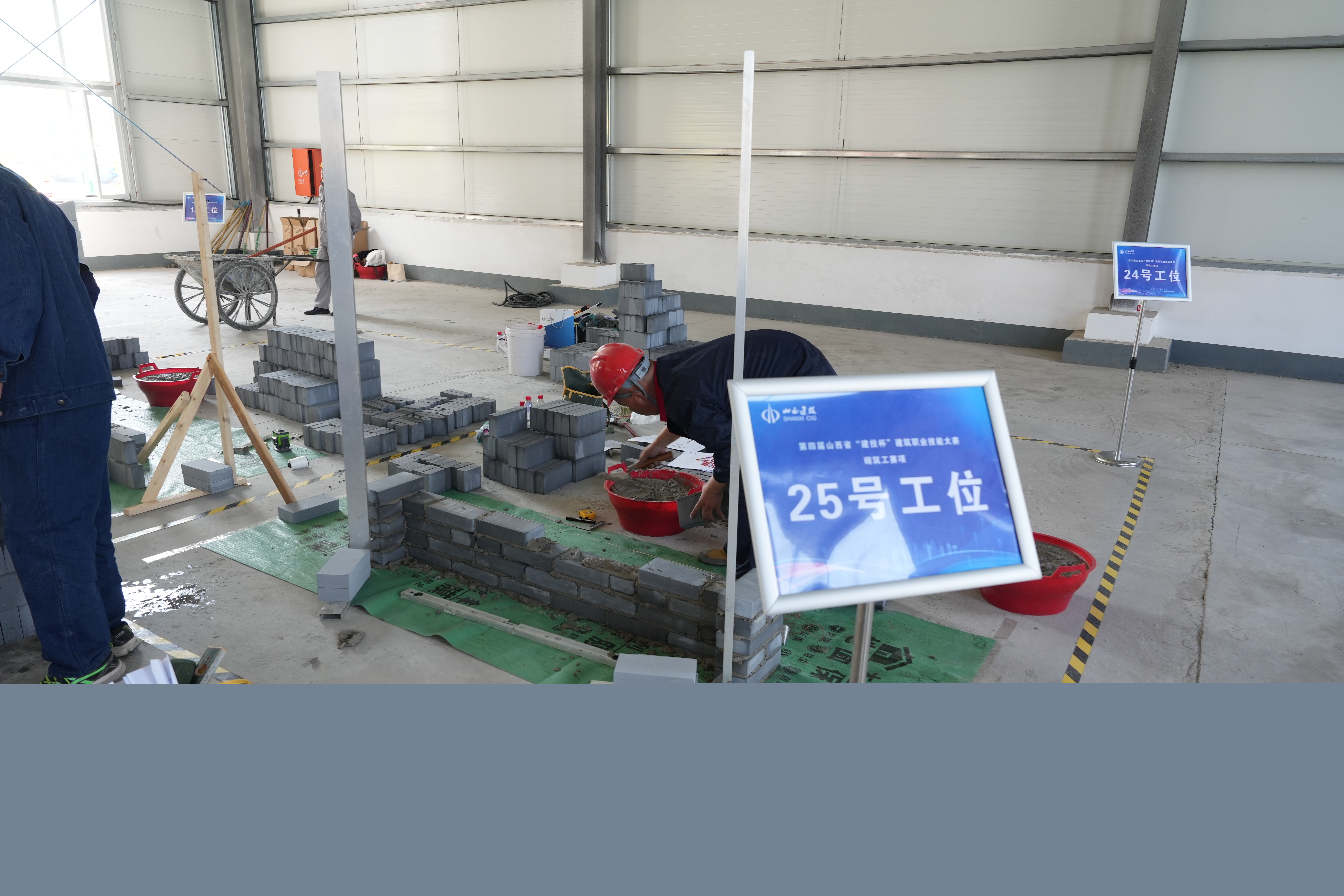 在砌筑工比賽現(xiàn)場,參賽選手正全神貫注進(jìn)行砌筑操作
