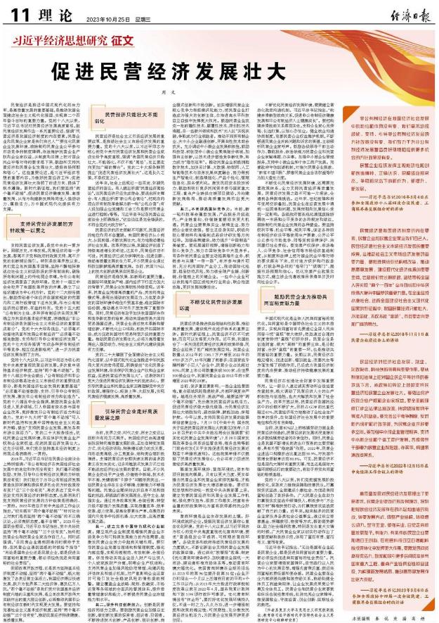 民營(yíng)經(jīng)濟(jì)是社會(huì)主義市場(chǎng)經(jīng)濟(jì)發(fā)展的重要成果,是推動(dòng)社會(huì)主義市場(chǎng)經(jīng)濟(jì)發(fā)展的重要力量。黨的十八大以來(lái),以習(xí)近平同志為核心的黨中央對(duì)民營(yíng)經(jīng)濟(jì)發(fā)展和民營(yíng)企業(yè)家成長(zhǎng)給予高度重視,強(qiáng)調(diào)“我國(guó)民營(yíng)經(jīng)濟(jì)只能壯大、不能弱化,不僅不能‘離場(chǎng)’,而且要走向更加廣闊的舞臺(tái)”。黨的二十大報(bào)告鮮明提出“促進(jìn)民營(yíng)經(jīng)濟(jì)發(fā)展壯大”,這是長(zhǎng)久之策,不是權(quán)宜之計(jì)。