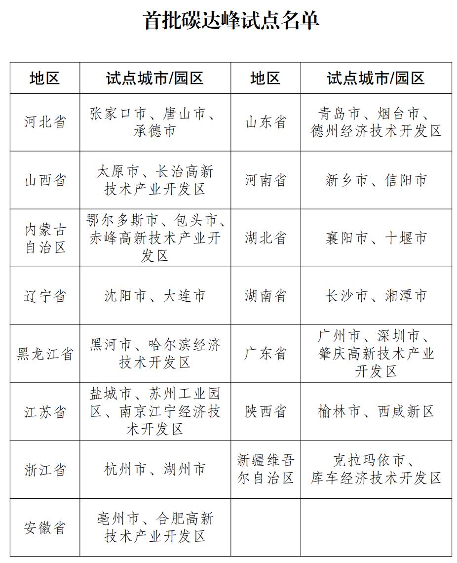 為落實國務(wù)院《2030年前碳達峰行動方案》(國發(fā)〔2021〕23號)有關(guān)部署,按照《國家碳達峰試點建設(shè)方案》(發(fā)改環(huán)資〔2023〕1409號)工作安排,經(jīng)有關(guān)地區(qū)城市和園區(qū)自愿申報、省級發(fā)展改革委推薦、省級人民政府審核、國家發(fā)展改革委復(fù)核,確定張家口市等25個城市、長治高新技術(shù)產(chǎn)業(yè)開發(fā)區(qū)等10個園區(qū)為首批碳達峰試點城市和園區(qū),現(xiàn)予公布,并就有關(guān)事項通知如下: