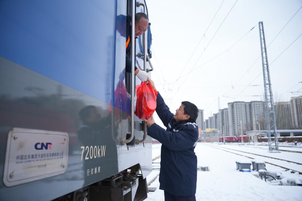 在太原火車站,工作人員將應(yīng)急食品送到機(jī)車司機(jī)手中。(中國鐵路太原局集團(tuán)有限公司供圖)