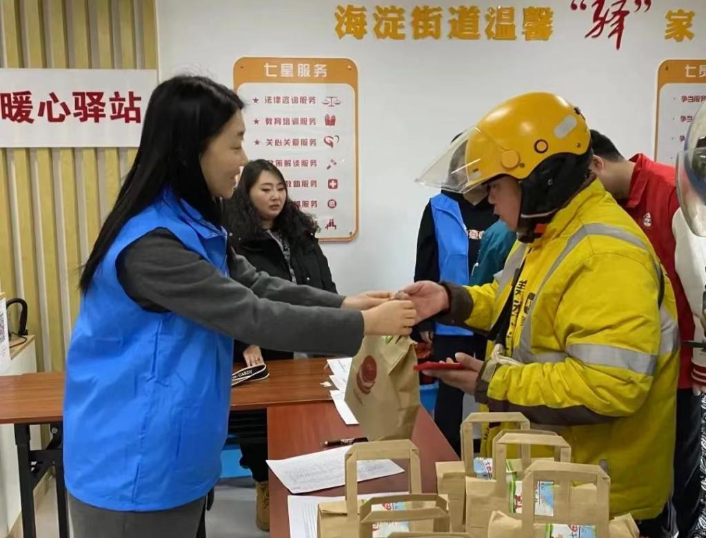 在北京市海淀區(qū)海淀街道,“溫馨驛家”13日開展了“小哥加油站,活力‘心’早餐”愛心活動,街道志愿者們將早餐提前打包好,發(fā)放愛心早餐50余份?!耙辉缑ζ饋頉]時間吃飯,沒想到在這還能吃到早餐,喝到熱騰騰的咖啡,特別感動?!币晃煌赓u小哥說。