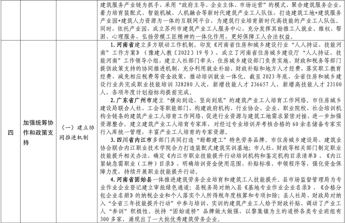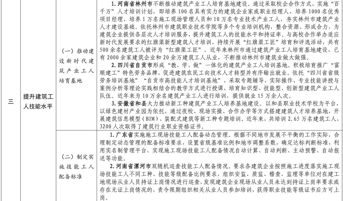 按照《住房和城鄉(xiāng)建設(shè)部等部門關(guān)于加快培育新時代建筑產(chǎn)業(yè)工人隊伍的指導(dǎo)意見》要求,各地圍繞推進(jìn)農(nóng)民工向新時代建筑產(chǎn)業(yè)工人轉(zhuǎn)型、完善建筑工人實名制管理、提升建筑工人技能水平、加強(qiáng)統(tǒng)籌協(xié)作和政策支持、保障建筑工人合法權(quán)益等方面,積極探索、大力推進(jìn)新時代建筑產(chǎn)業(yè)工人隊伍建設(shè),取得了積極成效。近日,住房和城鄉(xiāng)建設(shè)部印發(fā)培育新時代建筑產(chǎn)業(yè)工人可復(fù)制經(jīng)驗做法清單(第一批)。