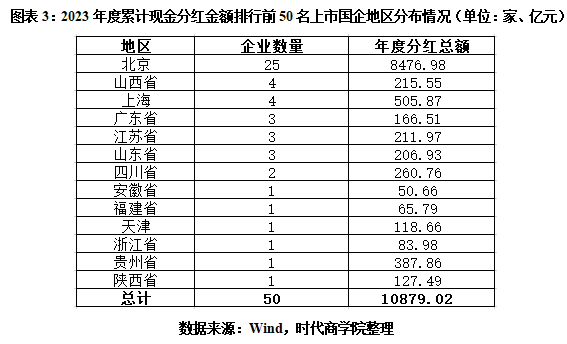 從地區(qū)分布情況來看,如圖表3所示,2023年度累計(jì)現(xiàn)金分紅金額排名前50的上市國企中,北京地區(qū)占據(jù)半數(shù),總計(jì)25家;山西省、上海市各4家,廣東省、江蘇省、山東省各3家;四川省2家;安徽省、福建省、天津、浙江省、貴州省、陜西省各1家。