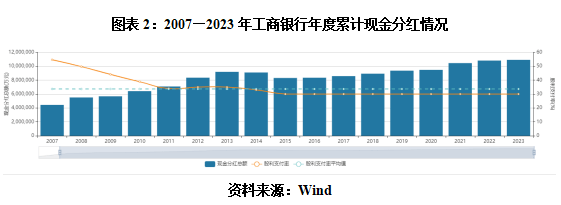 如圖表2所示,2021—2023年,工商銀行的年度累計(jì)現(xiàn)金分紅金額分別為1045.34億元、1081.69億元、1092.03億元,連續(xù)三年超千億元,呈連續(xù)增長態(tài)勢。2007—2023年,工商銀行連續(xù)17年穩(wěn)居A股上市國企“分紅王”寶座。