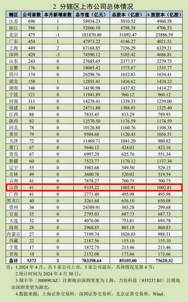截至4月末,境內(nèi)股票市場共有上市公司5372家,滬、深、北證券交易所分別為2272、2852、248家。分股份類型統(tǒng)計(jì),僅發(fā)A股公司5139家,僅發(fā)B股公司11家,A+B、A+H等多股份類型的公司222家;分控股類型,國有控股和非國有控股公司數(shù)量分別占比26%、74%;按省域劃分,廣東、浙江、江蘇上市公司家數(shù)分別為874、707、696家,匯集超40%上市公司。(記者姚均芳)