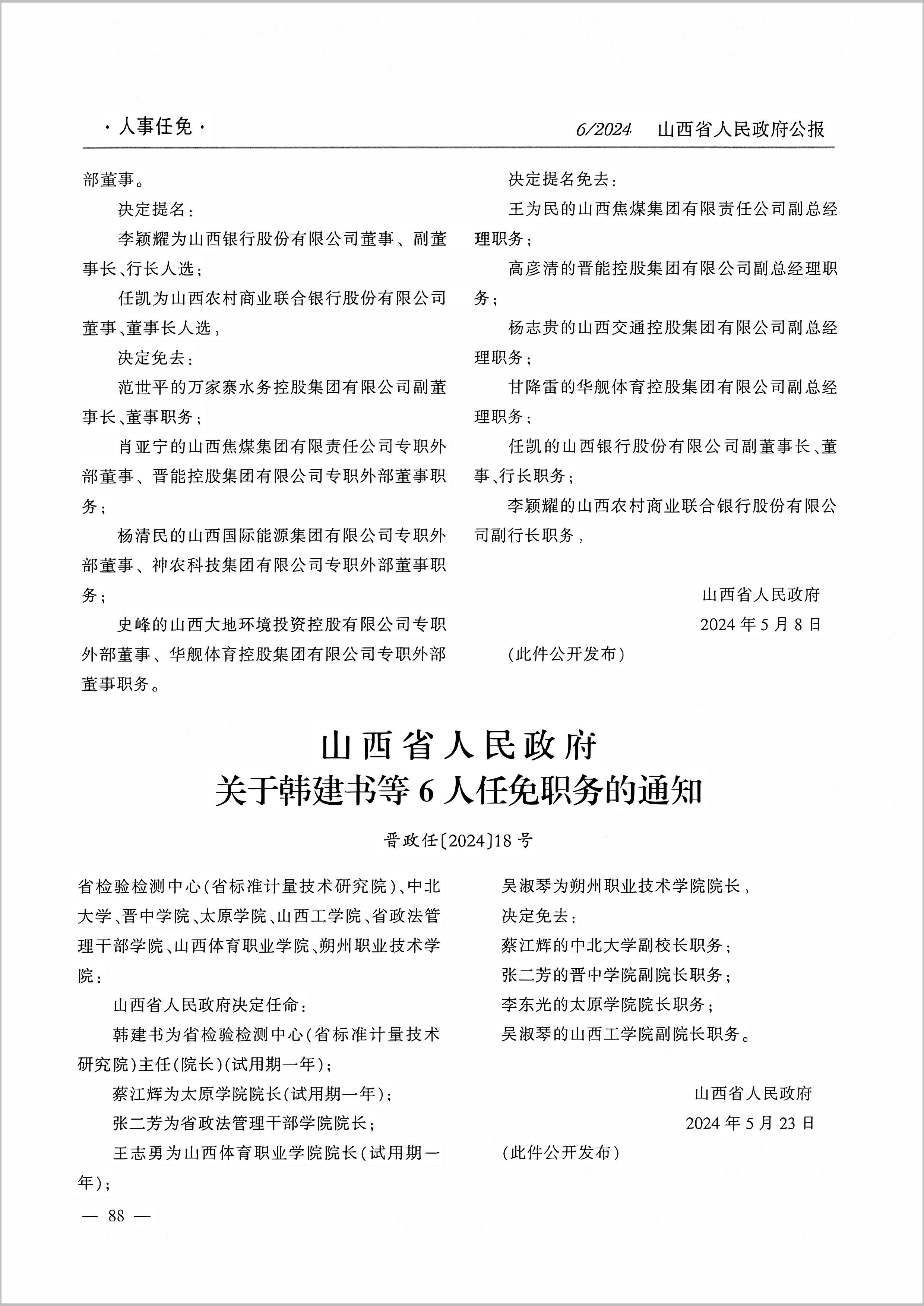 決定任命——韓建書為省檢驗(yàn)檢測中心(省標(biāo)準(zhǔn)計量技術(shù)研究院)主任(院長);蔡江輝為太原學(xué)院院長;張二芳為省政法管理干部學(xué)院院長;王志勇為山西體育職業(yè)學(xué)院院長;吳淑琴為朔州職業(yè)技術(shù)學(xué)院院長。