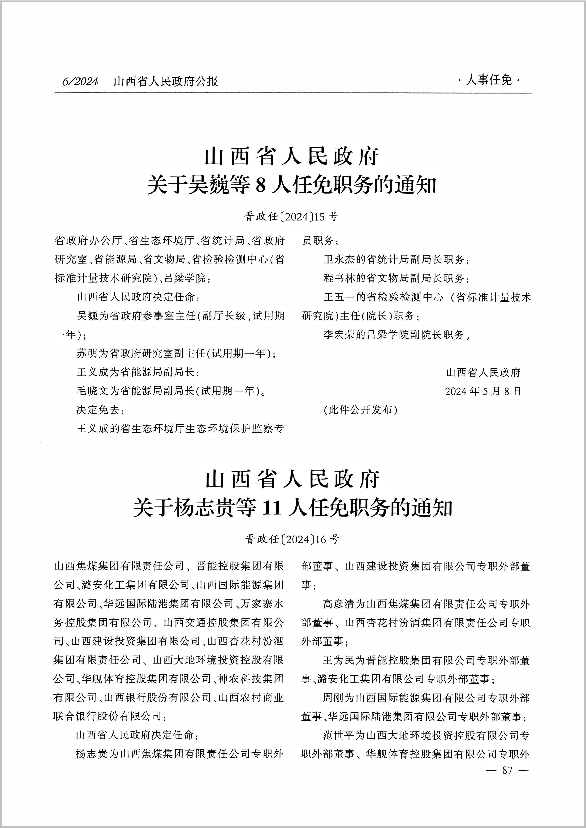 決定任命——楊志貴為山西焦煤、山西建設(shè)投資集團(tuán)有限公司專職外部董事;高彥清為山西焦煤、山西杏花村汾酒集團(tuán)有限責(zé)任公司專職外部董事;王為民為晉能控股、潞安化工集團(tuán)有限公司專職外部董事;周剛為山西國際能源、華遠(yuǎn)國際陸港集團(tuán)有限公司專職外部董事;范世平為山西大地環(huán)境投資控股、華艦體育控股集團(tuán)有限公司專職外部董事。