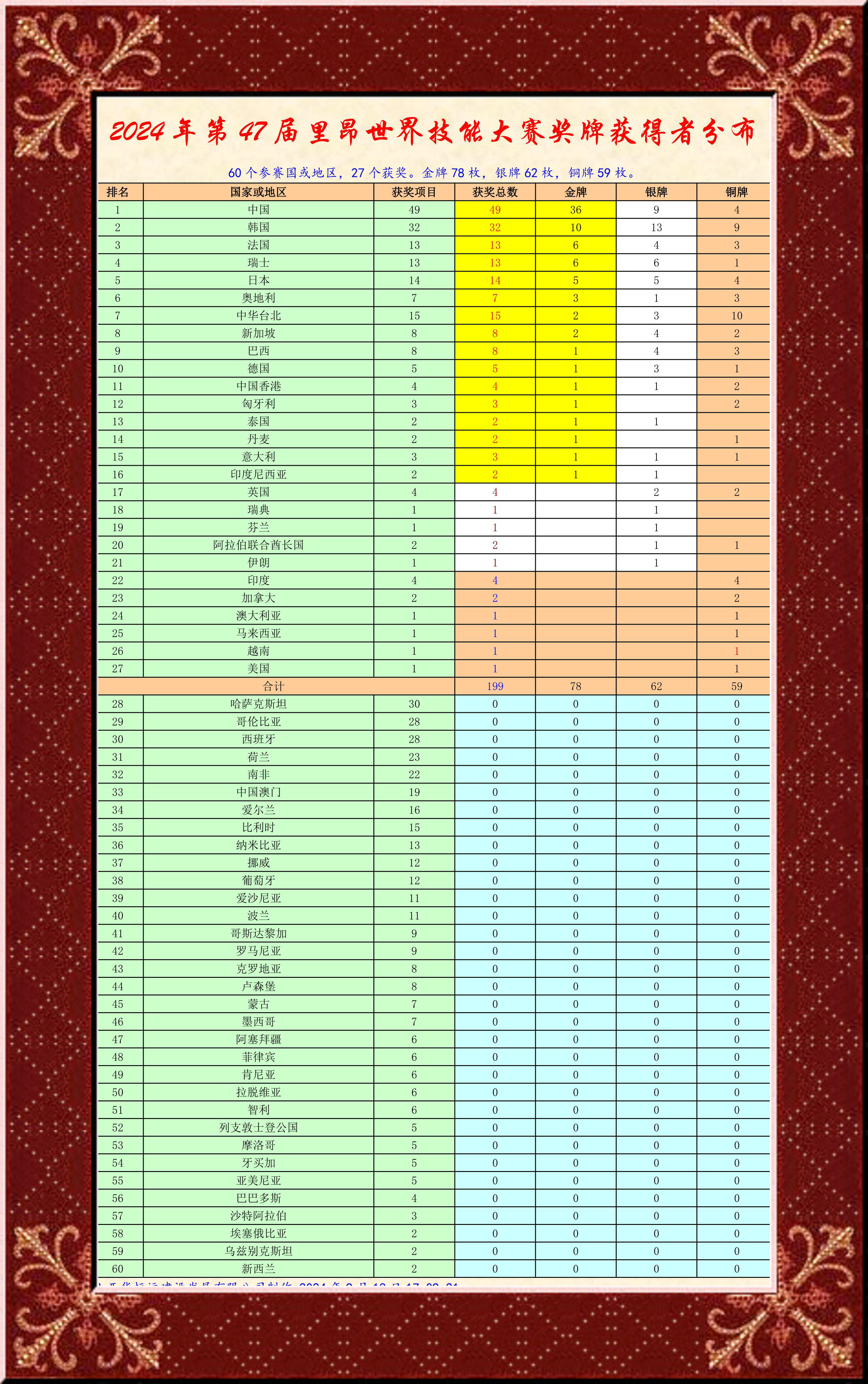 2024第47屆世界技能大賽中國代表團(tuán)獎(jiǎng)牌榜