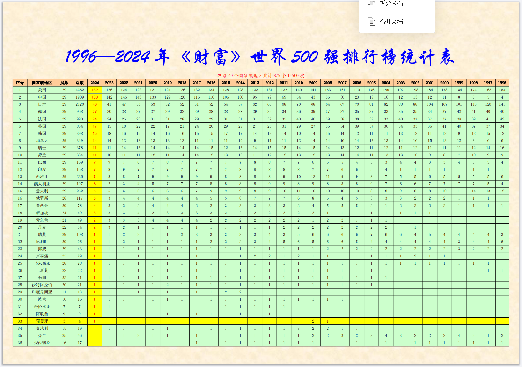 《財(cái)富》世界500強(qiáng)雜志社,從1995年開始在中國(guó)登陸,已經(jīng)連續(xù)舉辦了29期中文版的世界500強(qiáng)排名榜,我收集到的完整資料,僅缺第一期1995年的全榜單,所以,目前只能編輯二十八期。即1996-2023年《財(cái)富》世界500強(qiáng)和中國(guó)上榜企業(yè)的名單,待日后有機(jī)會(huì)的話再補(bǔ)齊。