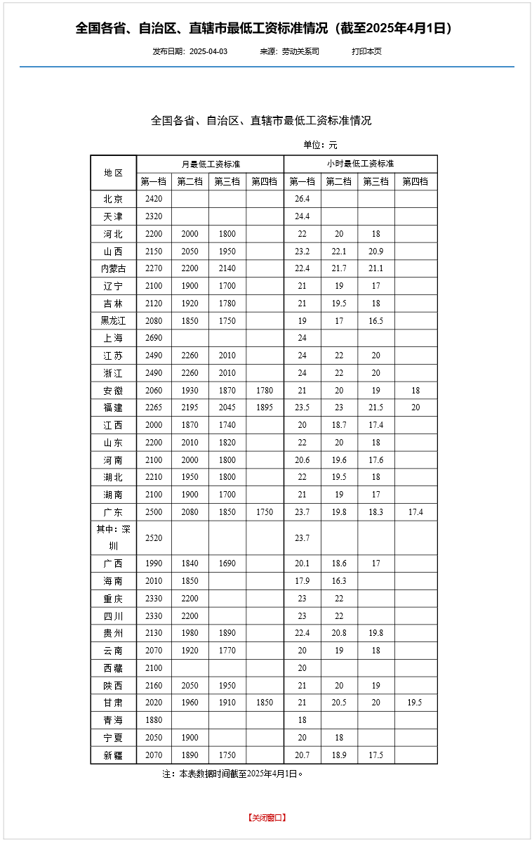 全國各省、自治區(qū)、直轄市最低工資標(biāo)準(zhǔn)情況(截至2025年4月1日)